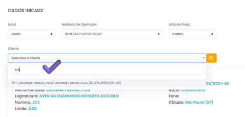 2- Informe o cliente; pode localizar pela razão social, fantasia ou CNPJ