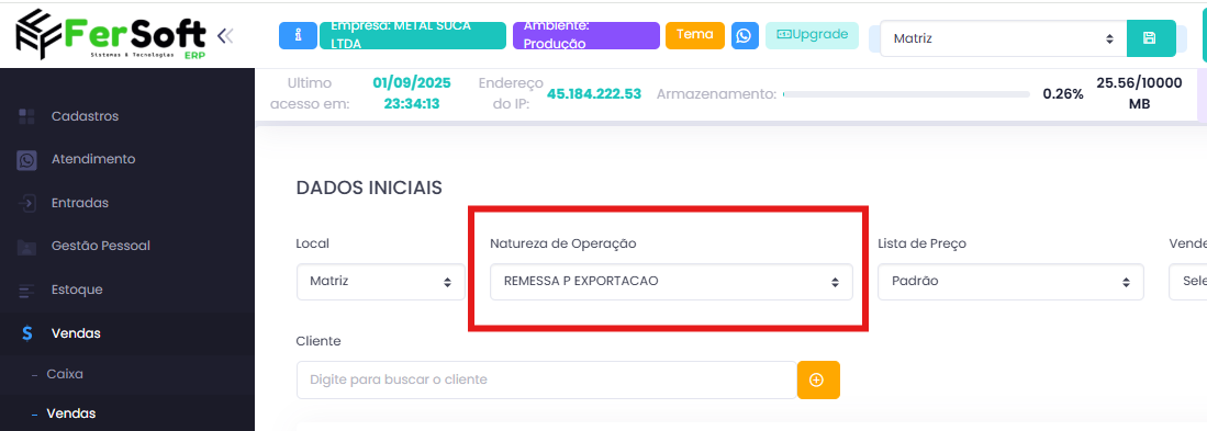 1- Na opção da Natureza de Operação: REMESSA P EXPORTACAO