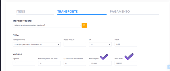 Obs. Quantidade e valor para casas decimas definida na configuração do emitente. Exemplo se a quantidade for 15000 quilos e se nas configurações estiver com 4 casa decimais será necessário acrescentar 00 até completar, o campo não aceita ponto nem virgula, deverá ficar assim 15000.0000. Mesmo caso para valor, se o preço for 0,80 deve ficar assim 0.80
